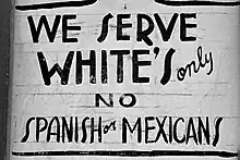 Discrimination against Mexicans in public facilities represented one of the most objectionable forms of prejudice. It was inferior treatment and some decided that they not taking second class treatment.[4] An example was when a Mexican couple wanted to be seated at the center section of the movie theatre but were asked to move just because they were Mexican.[4] They were given the option to sit at the very front, side aisles, and the balcony which were known to be the least comfortable. When the male Mexian American offered to pay the difference for the better seats, he was denied.[4] Many other business displayed an "Whites only" not only leaving out Mexicans, but many other ethnicities.