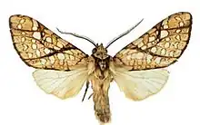 The length of the forewings is about 18 mm. The ground colour is yellow with white spot bands. The basal band has one white spot highlighted with brown. The postbasal, antemedian, median, postmedian and subterminal bands are formed by rounded white spots intercalating between veins. The wing is crossed by two narrow brown transverse lines. The fringe is brown. The hindwing is white and semi-translucent. The anal margin is more densely scaled with yellow.