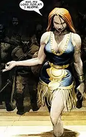 While Midgard and Asgard battle against Surtur and the Sons of Muspel, Enchantress (aka Amora) appears in Lorelei's apartment, suggesting that they put aside their differences to help Asgard. Suspecting a trap, Lorelei refuses; Amora vows revenge and disappears.[11] The battle ends; Surtur and Odin disappear. Loki returns Lorelei to Asgard to help comfort Thor, hoping that this will help in Loki's bid to become Asgard's new ruler. Loki has Lorelei drink the elixir of Lofn; when Thor inhales it, he falls so deeply in love with her that he does whatever she says. Lorelei was tiring of Thor, but agreed to Loki's scheme only to help Thor become monarch so he would make her his queen.[12] Amora appears and, as revenge, casts a love spell on Odin's scepter, so that when Loki picks it up and Lorelei sees him she will fall madly in love with him. Amora believes that loving the heartless Loki would eventually destroy Lorelei emotionally.[13]