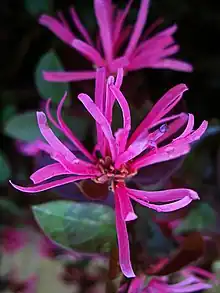 Loropetalum chinense is commonly known as loropetalum,[1] Chinese fringe flower and strap flower.[2] Two forms of L. chinense exist; a white- (to pale-yellow-) flowering green-leafed variety and a pink-flowering variety with leaves varying from bronze-red when new to olive-green or burgundy when mature, depending on selection and growing conditions.