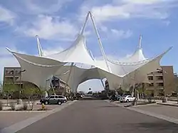 Three concepts for the development were presented in early 2005. The winning proposal featured a large set of shade sails, dubbed SkySong, and a design inspired by La Rambla in Barcelona.[60] The site was rezoned to permit taller buildings by a unanimous city council vote in June.[61] Opposition by residents to the design of the shade sculpture[62] led to the developers revising the design to cover a smaller area.[63] The center formally adopted the SkySong name in 2006,[64] and the first two office buildings on the property opened in 2008.[59]