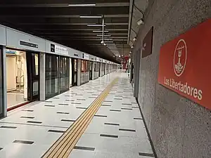 Los Libertadores is an underground metro station of Line 3 of the Santiago Metro network, in Santiago, Chile. It is an underground, between the Ferrocarril and Cardenal Caro stations on Line 3. At the time of its inauguration, it was the terminal station of Line 3 on the north. It is located at the intersection of Los Libertadores Highway with Américo Vespucio Norte Avenue.