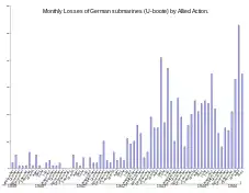 | Month, year | Imports to Allies | Sunk by U-boat | Sunk by aircraft | Sunk by warship or raider | Sunk by mines | Total Allied shipping sunk | German submarines lost |
