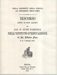 - 1884 – Della Necessità della Lingua al Progresso dell’Uomo (On the Need of Language for the Progress of Man).[2] A 20-page pamphlet in Italian published in Malta (Zefirino Micallef Tipografia) in which Farrugia elaborates on various literary themes around the concept of human progress. The work reproduces a talk given by Farrugia on September 6, 1884, at Flores College, Valletta. Throughout the talk he cites various authors, such as Dante, Manicino, Soave, Blames and others.