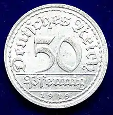 Reverse of the first coin of the Weimar Republic. Design by Louis Oppenheim.
