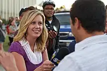 Hodge doing an interview during the Space Shuttle Endeavour travel to the California Science Museum