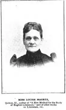 Louise Maertz died in 1918, aged 80 years. There is a plaque in Quincy, Illinois, placed by the Quincy Women's Club, honoring several "Pioneer Women" of the town, including Louise Maertz.[8] At her death, her estate funded the establishment of a "waif's home" for black children in Quincy.[10]