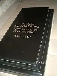 Louise died in the Château de Moulins in Moulins, Allier on 29 January 1601 and all her property was distributed or used to pay her debts. In September 1603, a papal bull ordered the construction of a Convent of Capuchins in Paris to bury her, which was done on 20 March 1608. Her remains, found in October 1805,[6] are located since 1817 in the royal crypt of Saint Denis Basilica. She was the only Queen consort prior to the French Revolution to actually be buried in a tomb bearing her name in Saint-Denis.[7]