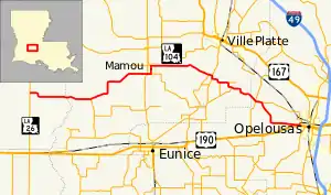 Louisiana Highway 104 (LA 104) is a state highway located in southwestern Louisiana. It runs 41.4 miles (66.6 km) in a west–east direction from LA 26 southeast of Oberlin to U.S. Highway 190 (US 190) in Opelousas.[1] Along the way, it passes through the town of Mamou and intersects various north–south routes that service points along US 190 such as Elton, Basile, and Eunice. East of Mamou, connections are also made to Ville Platte, the St. Landry Parish seat, on US 167/LA 10.