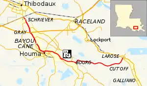 Continuing through East Houma, LA 24 bends to the southeast with Bayou Terrebonne. An intersection with LA 3087 (Prospect Boulevard) provides a connection with LA 182 north of the city. While passing alongside the Houma-Terrebonne Airport, LA 24 begins to follow Bayou Petit Caillou, which branches off of Bayou Terrebonne. In an area known as Presquille, LA 56 picks up this route, while LA 24 makes a zigzag across both Bayous Petit Caillou and Terrebonne, exiting the Houma city limits, to assume the path of LA 659. Passing through the community of Bourg, LA 24 intersects LA 316 and crosses another lift bridge over the Company Canal. Shortly afterward, LA 24 turns northeast away from Bayou Terrebonne at Klondyke while LA 55 assumes the route southeast toward Montegut. LA 24 then curves eastward again and crosses from Terrebonne Parish into Lafourche Parish.[2][3][4]
