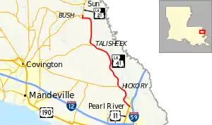 Louisiana Highway 41 (LA 41) is a state highway located in St. Tammany Parish, Louisiana. It runs 23.07 miles (37.13 km) in a north–south direction from the junction of U.S. Highway 11 (US 11) and LA 3081 in Pearl River to LA 21 in Bush.