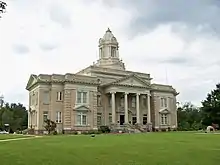 The town was laid out in 1794. It was named Louisville pursuant to 1786 plans of the Georgia Legislature for a new state capital. Louisville served as capital of the state of Georgia for 11 years, from 1796 to 1806; the capital then moved to Milledgeville.[2] Only one structure from that period is known to have survived. A statehouse building which was the capitol, was built; its site is now occupied by the Jefferson County Courthouse.[2] Architect Willis F. Denny designed the Beaux Arts courthouse which was completed in 1904. Denny also designed two adjacent two-story brick commercial structures on the southwest side of Broad Street between Mulberry and Green Streets. These have Victorian-era commercial detailing (see photo #11).[2]