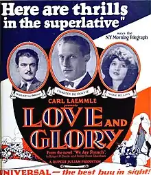 Love and Glory is a 1924 American silent drama film directed by Rupert Julian and starring Charles de Rochefort, Wallace MacDonald, and Madge Bellamy.[1][2]