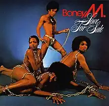 The standard cover art features the male member Bobby Farrell "naked [with] a futuristic golden thong"[2] chaining female members, resembling African sexual slaves.[3][4] American label Atlantic Records found the cover "raunchy",[5] so they used the standard back cover of a vinyl sleeve featuring the band wearing clothes[6][7] as the alternative front cover of American and Canadian edition.[5][8][9] One of the female group members, Liz Mitchell, told The Sydney Morning Herald:[10]