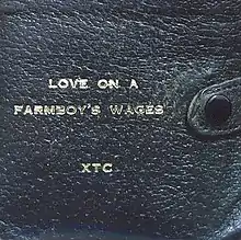 "Love on a Farmboy's Wages" is a song written by Andy Partridge of the English rock band XTC, released as the third single from their 1983 album Mummer. It peaked at number 50 on the UK Singles Chart. Partridge wrote the song during the aftermath of the cancelled English Settlement tour. It features a key modulation from E to F# before its bridge. Drummer Terry Chambers left the band during rehearsals for the song. The single's cover art is a photograph of Partridge's actual wallet with the title embossed.[2]