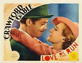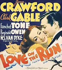 Love on the Run is a 1936 American romantic comedy film, directed by W.S. Van Dyke, produced by Joseph L. Mankiewicz, and starring Joan Crawford, Clark Gable, Franchot Tone and Reginald Owen in a story about rival newspaper correspondents assigned to cover the marriage of a socialite.[2] The screenplay by John Lee Mahin, Manuel Seff and Gladys Hurlbut was based on a story by Alan Green and Julian Brodie. Love on the Run is the seventh of eight cinematic collaborations between Crawford and Gable.[3] At the time of its release, Love on the Run was called "a lot of happy nonsense" by critics, but a huge financial success, nonetheless.