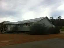 The building is set in a large gravel parking area amongst farmland. The building is fibre board on a timber frame with a corrugated iron roof and has a gabled portico over the main entrance.[2]