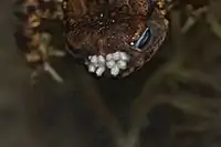 Alternatively, the eggs may be laid in wounds and eat the hosts flesh. When the toad has died and the larvae have totally consumed its tissues and finished their development, they make their way into the soil and pupate. The larvae are sensitive to temperature and only thrive between 14 °C and 29 °C. If they are cooled below this range they will stop feeding and attempt to leave the host and bury themselves shallowly in the soil to hibernate.[2]