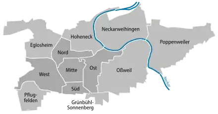 Ludwigsburg (German pronunciation: [ˈluːtvɪçsˌbʊʁk]; Swabian: Ludisburg) is a city in Baden-Württemberg, Germany, about 12 kilometres (7.5 mi) north of Stuttgart city centre, near the river Neckar. It is the largest and primary city of the Ludwigsburg district with about 94,000 inhabitants. It is situated within the Stuttgart Region, and the district is part of the administrative region (Regierungsbezirk) of Stuttgart.