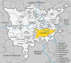 The following towns are neighbouring towns of Ludwigsburg, starting north of the city and going clockwise: Freiberg am Neckar, Benningen am Neckar, Marbach am Neckar, Erdmannhausen, Affalterbach, Remseck am Neckar, Kornwestheim, Möglingen, Asperg und Tamm.