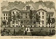 In 1903 the educational reformer Kentucky University president Burris Jenkins, a graduate of Harvard University and Bethany College (West Virginia), recruited Luella St. Clair to serve as the new president of Hamilton Female College in Lexington, Kentucky.[8] Though the school had been chiefly owned by the members of the local Christian Church (Disciples of Christ), Kentucky University (later Transylvania University) had in 1878 bought a stake in the school, taking total control in 1903. This change in leadership forced out Hamilton's current president, Barton C. Hagerman, the husband of Mary Campbell who was the granddaughter of the founder of the Disciples Church.[9] Hagerman started a new school for women, called Campbell-Hagerman College, also a private, women's college affiliated with the Disciples of Christ only four blocks away.