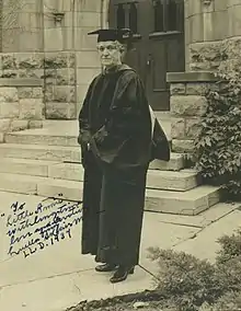 They moved to Columbia, Missouri in the summer of 1893 where both Franklin and Luella were interviewed for the position of president of Christian Female College, another school affiliated with the Christian Church (Disciples of Christ).[4] William S. St. Clair came with them from Colorado and was hired as a teacher of philosophy and religion.[5] Franklin died on November 21, 1893, and the trustees of Christian Female College then - as had been prearranged - appointed Luella St. Clair to the college presidency. She was one of the first women in the U.S. to be appointed a college president. Her goal was to make her college the "Vassar of the West" and insisted that the students use the academic cap and gown as the official uniform rather than the traditional Christian College bonnets.[4]