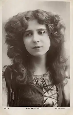 In her youth she often appeared with her sister Valli Valli in concerts, the two being in great demand at private parties, travelling nearly all over the country to appear together in "at homes". The sisters toured in Morocco Bound (1893).[3] Lulu Valli acted as the good fairy Truth in the children's pantomime The House that Jack Built at the Opera Comique in 1894,[1][4] while in 1897 she appeared at the Strand Theatre in The Prodigal Daughter. In 1903 she created the role of Miss Yost (the Typewriter) in the Edwardian musical comedy The School Girl at the Prince of Wales Theatre in London[5] before playing Mamie Reckfeller in the Broadway production in 1904.[6] Over the Christmas season of 1909 to 1910 she appeared as the Principal Boy in the pantomime Mother Hubbard at the Prince's Theatre, Bristol.[7][8][9] During 1910 and 1911 she was in the play In Old Kentucky, again at the Prince's Theatre in Bristol.[10] In 1914 she played in the revue Keep Smiling at The Empire Palace in London, in which "The main business of the revue is done by Lulu Valli, who is dainty and clever in a dozen ways..."[1][11]