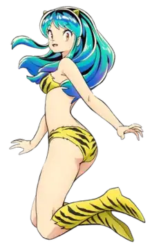 Lum is royalty and the daughter of the Oni alien Invader and is capable of flying and generating massive electrical discharges.[4][6][9] She generally wears a tiger-striped bikini and Go-Go Boots which highlight her shapely figure,[4][5][9] and has two tiny horns on her head[5] that, when sprayed with a special solution, can be shaped to resemble barrettes. When these horns are removed (or when specially blessed yellow ribbons are tied around them), her electric and flying abilities disappear and she becomes a regular girl. Her hair color was originally iridescent and ever-changing in the manga; due to difficulties in making such an effect possible at the time the anime was originally produced, Lum's hair was given the shade of cyan it is best known for. Lum's appearance and clothing (and that of her family) draw heavily on the Japanese god of thunder, Raijin.