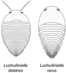 Luohuilinella is an extinct genus of xandarellid artiopodan arthropod known from the Chengjiang biota of China. The type species Luohuilinella rarus was described in 2012.[1] A second species Luohuilinella deletres was described in 2018.[2] Both taxa are rare components of the assemblage. Like other Xandarellids and most artiopodans, it possessed an unmineralised exoskeleton. The type and currently only known specimen of L. rarus is known from a dorsal exoskeleton, around 17 mm long and 9 mm wide which consists of 27 tergites with pronounced pleural spines. L. deletres is much larger, with specimens being over 10 cm long, L. deletres possessed at least 11 pairs of biramous appendages. Both taxa are dorsoventrally flattened, making a benthic or nektobenthic lifestyle probable. Both taxa have pronounced notches in the cephalon to accommodate the stalked eyes.