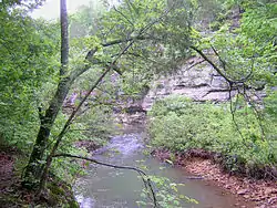 Lusk Creek Canyon is the name of a 906 acres (367 ha) canyon located within the Lusk Creek Wilderness Area of the Shawnee National Forest in Pope County, Illinois. The area is a large gorge formed by the erosion of Pennsylvanian sandstone around a large horseshoe bend in the creek. It contains plants such as fan leafed clubmoss, cinnamon fern, royal fern as well as ten endangered or threatened plant species.[1] It was designated a National Natural Landmark in 1980.[2]
