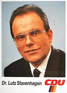 Lutz-Georg Stavenhagen (6 May 1940 in Jena - 31 May 1992 in Pforzheim) was a German politician and member of the Christian Democratic Union of Germany (CDU). He was Minister of State in the Foreign Office from 1985 to 1987 and Minister of State in the Federal Chancellery from 1987 to 1991.