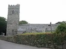 The parish church, originally Norman, was entirely rebuilt in granite in the 15th century. It is dedicated to St Ciricius and St Julitta. The tower is without buttresses or pinnacles and the south porch has battlements and a handsome tunnel-vault. It still has the Norman font (very similar to that at St Austell) and the east window is a monument to Silvanus Trevail, d. 1903. Near the church is a holy well (also 15th century).[10][11] The Cornish Stannary Court of the Tinners' Parliament kept its records, seal and charter stored in a turret of the church tower. During the English Civil War these were removed to Lostwithiel and then disappeared.[12]