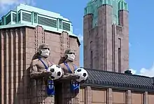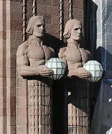 Lyhdynkantajat (Finnish for "the lantern bearers") is a group of sculptures at the front door of the Helsinki Central Station in Helsinki, Finland. The sculptures were designed by Emil Wikström and completed in 1914. Lyhdynkantajat is part of the facade of the Art Nouveau station designed by Eliel Saarinen.[1]