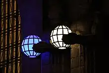 At night time, the spherical lanterns born by the sculptures are lit.