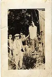 In the post–Reconstruction era, lynching photographs were printed for various purposes, including postcards, newspapers, and event mementos.[90] Typically these images depicted an African American lynching victim and all or part of the crowd in attendance. Spectators often included women and children. The perpetrators of lynchings were not identified.[91] The 1916 lynching of Jesse Washington in Waco, Texas, drew nearly 15,000 spectators.[90] Often lynchings were advertised in newspapers prior to the event in order to give photographers time to arrive early and prepare their camera equipment.[92]