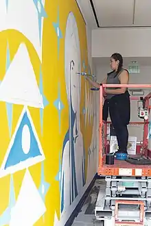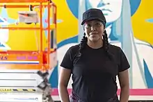 Lynnette Haozous is an artivist, using art for positive social change to empower and strengthen communities.[3] She works in many mediums including painting, jewelry, screen-printing, writing, and acting, but is most well known for her murals, which use a combination of spray paint and stencils.[4] Haozous has said, "What I like about doing murals is that they speak directly to the community; they're readily available. You can speak directly to the people about these social issues that are impacting them in their own neighborhoods and communities."[7]