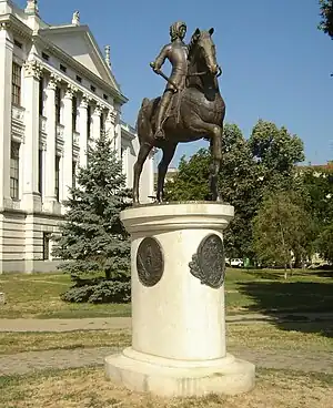 The back of the museum, in the foreground, a statue of Hunyadiak