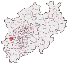 Mönchengladbach is located in western North Rhine-Westphalia. As of the 2021 federal election, it is coterminous with the independent city of Mönchengladbach.[1]