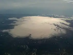 Mýrdalsjökull (pronounced [ˈmirˌtalsˌjœːkʏtl̥] ⓘ, Icelandic for "(the) mire dale glacier" or "(the) mire valley glacier") is an ice cap in the south of Iceland. It is to the north of Vík í Mýrdal and to the east of the smaller ice cap Eyjafjallajökull. Between these two glaciers is Fimmvörðuháls pass. Its peak reaches 1,493 m (4,898 ft) in height and in the year 1980 it covered an area of approximately 595 km2 (230 sq mi).