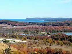 M-109 bisects the two bodies of water (Glen Lake) in the foreground, Sleeping Bear Bay of Lake Michigan in the background