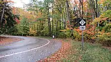 M-37 through the south side of the Grand Rapids area was realigned in late 1949 or early 1950. After the change, the highway follows Broadmoor Avenue to 28th Street and 28th Street west to its former routing along Kalamazoo Avenue.[36][37] In 1953, this routing was shifted further when M-37 was rerouted to run north on East Beltline Avenue concurrent with US 131 and M-21 to Cascade Road. There it turned west along Cascade Road and Fulton Street into downtown back to its existing alignment.[38][39] During that same time frame, the gap in the routing between M-55 and Mesick was eliminated.[40][41] The highway was moved to bypass Sparta, Kent City and Casnovia to the southwest in the 1962.[42][43] Another change around the same time frame shifted M-37's routing through Grand Rapids again. This time, M-37 was rerouted to follow M-11/M-21 along 28th Street to the US 131 freeway north to I-96 and back to Alpine Avenue.[44][45] The final Grand Rapids routing change was made in 1969 when M-37 was moved to its current course along East Beltline Avenue and I-96.[46][47] This change resulted in a concurrency with the southernmost end of M-44 that was later removed in 1977 when M-44 was truncated northward.[48][49] A proposed new routing near Comstock Park in the 1970s would have removed M-37 from Alpine Avenue. The new highway, if built, would have run southeastward from the Alpine Avenue split to US 131 near 6 Mile Road.[50] In 2008, the northernmost 18 miles (29 km) on the Old Mission Peninsula were designated what is now a Pure Michigan Scenic Byway by MDOT.[7] In 2013, the hairpin curve on a hill north of Mesick was straightened and the hill slightly leveled.[51]
