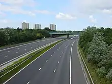 View of the M57 northwards from the bridge on Knowsley Lane. On the left can be seen the three tower blocks of Stockbridge Village.