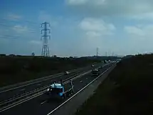 According to the statutory instrument that authorised its construction, the road is officially classified as a 'special link road to connect the [M65/M61 roundabout] with the all-purpose road known as Tramway Lane'.[8] According to Lancashire County Council, it is the 'M61 Link Tramway Lane to Junction 9' and is part of the M61.[9] In 2007, the approach signs from Walton Summit were modified to read 'M61', but the signs still mark the roundabout at the eastern end.