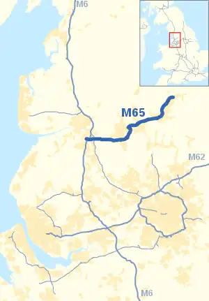 The M65 is a motorway between Preston and Colne in Lancashire, England. It runs from Bamber Bridge just south of Preston, through major junctions with the M6 and M61 motorways, east past Darwen, Blackburn, Accrington, Burnley, Brierfield, Nelson and ends at Colne.