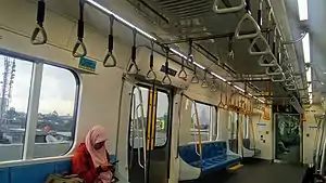Each car measures approximately 20 m (65 ft 7 in) in length, 2.9 m (9 ft 6 in) in width and 3.9 m (12 ft 10 in) in height, similar dimensions to many Japanese commuter trains.[6] These trains use the CBTC signaling system and are equipped with automatic train operation (ATO) under GoA 2, with drivers operating the doors and driving in case of emergency.[7] Like the KRL Commuterline, the MRT trains are also powered via overhead catenary.[8]
