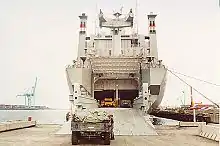 MV Cape Taylor (T-AKR-113) is a roll-on/roll-off (RO/RO) ship with the Ready Reserve Force (RRF) of the United States Department of Transportation's Maritime Administration (MARAD).[4] As of 31 December 2014, her homeport is the Port of Houston in Houston, Texas, and she is on ROS-5 status; she is able to be fully operational within 5 days of being activated.[1] When activated, she becomes part of the United States Navy's Military Sealift Command (MSC).[6]
