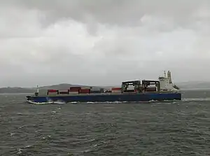 Cargo capacity is 2,286 TEU container space, or 65,338 cubic metres (2,307,400 cu ft) of grain or 65,298 cubic metres (2,306,000 cu ft) of bale goods. These are carried in eleven holds. Two Munck gantry cranes are fitted, each with a lift capacity of 68 tonnes (67 long tons), and which can travel the length of the ship. Accommodation for her 25 crew is at the aft of the ship.[2]