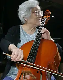 ![]() Ma Siju playing Jin Yuzhen's cello at home | |