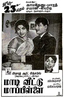Maadi Veettu Mappillai (transl. The Son-in-Law who stays on the top floor) is a 1967 Indian Tamil-language comedy film, directed by S. K. A. Chari. A remake of the Telugu film Illarikam (1959),[3] it stars Ravichandran and Jayalalithaa, with Nagesh, Rama Prabha, V. K. Ramasamy, Balaji, Major Sundarrajan, T. S. Muthaiah, Udaya Chandrika and P. K. Saraswathy in supporting roles. The film was released on 23 June 1967.