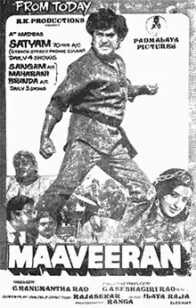 Maaveeran is a remake of Manmohan Desai's 1985 Hindi film Mard, and even used some footage from that film.[1] It was shot in the expensive 70 mm film format, becoming the first Tamil film to do so.[2][3] Sivaji Ganesan was initially attached to star in the film, but later opted out.[4] The film was prominently shot in Mysore, including the Mysore Palace.[5]